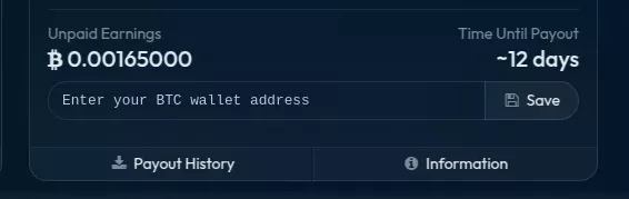 To provide the best non-custodial user experience, we offer automated Bitcoin payouts for all our users. You only need to save your BTC wallet address right on the main page of your dashboard account. Your unpaid earnings will automatically be paid out to your wallet address as soon as they have reached the eligibility threshold (this is to keep fees as small as possible).