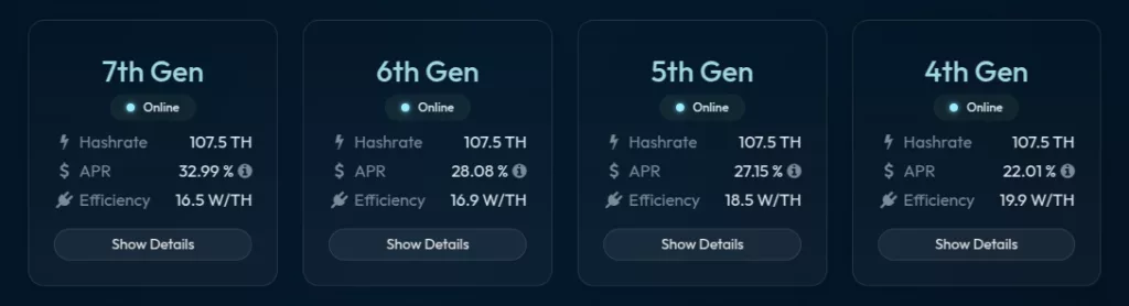 We will always provide the best efficiency contract, backed by the newest and most efficient Bitcoin miners, as the default purchase option. Auto-compounding also buys the best efficiency contracts. This ensures the best long-term profitability and ROI (return on investment) for all customers.