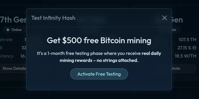 To give everyone the opportunity to test contracts before buying, we have added a free 30-day testing phase, where you get $500 worth of hashrate in the newest contract and receive real daily mining rewards with no strings attached.