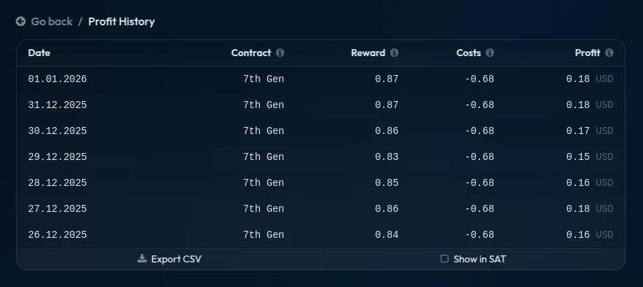 Each generation of contracts has a specific mining efficiency in W/TH (watts per Terahash). The better the efficiency (lower W/TH = better), the higher the profitability of a contract because less electricity is used to mine a set amount of BTC. Our oldest, least efficient miners start with “1st Gen” contracts. The newest, most efficient miners are represented as the highest contract generation (“7th Gen” at the time of writing this blog post).