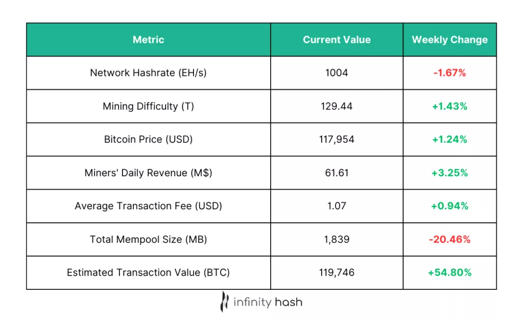 Network conditions this week were shaped by a fresh difficulty increase following the recent hashrate peak, which has slightly affected mining profitability. Despite this, miner revenues improved as Bitcoin’s price continued to climb, supported by a generally bullish market tone. Transaction activity also saw a surge in value transferred on-chain, and fee levels ticked higher. This combination of steadier throughput and improved price action helped offset the revenue pressures from higher difficulty.